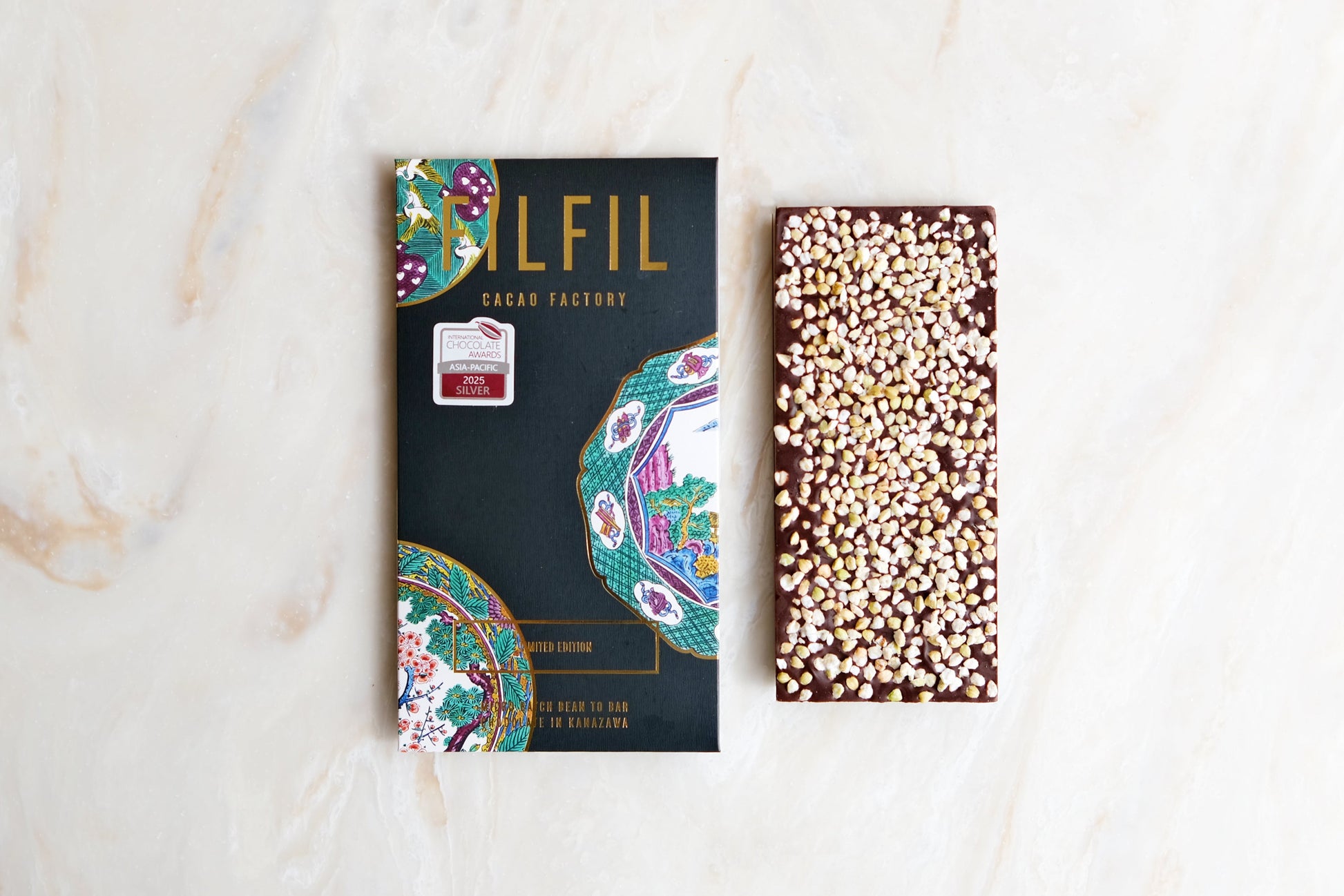 焙煎された香ばしい香りと自然な甘味が特長の加賀棒茶を、ベリー系の酸味とイチジクのような奥行きある濃厚でフルーティーなフレーバーが魅力のホンジュラス産のカカオ豆から作るダークチョコレートに練り込んで仕上げています。ひと口含むと加賀棒茶とカカオのダイレクトな風味が広がり、バランスの良い甘味と苦味の余韻を楽しめます。カリッと音を立てるトップの蕎麦の実(白山市産)は砕くほどに棒茶の香り高さを引き立たせ、味わいに奥深さを演出します。