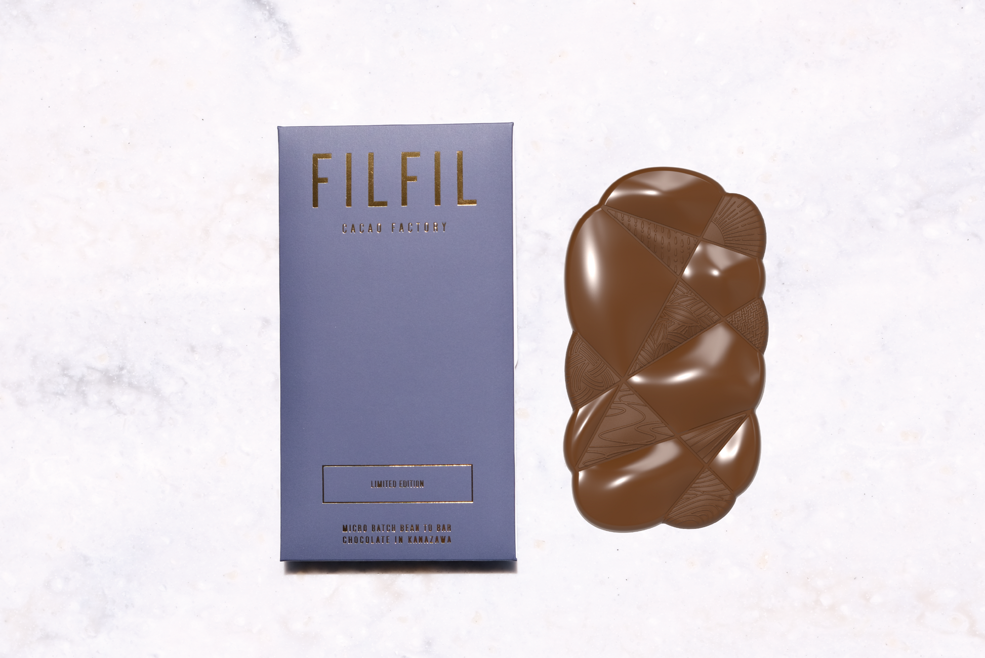 FILFILのFIL はフランス語で「糸」を意味しており、カカオからチョコレートになるまでの沢山のストーリーや想い、カカオと金沢の風景が、糸で結ばれている様子をタブレットに表現しています。